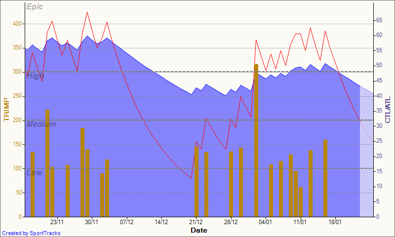 Did make me wonder with two heavy colds in the space of two months, how much of this was due to over training. In an attempt to apply some science, I got the Training Load plugin up and running and analysed the period in question. In the graph the redline shows fatigue (or overtraining), the blue line is the fitness level, and the yellow bars show the intensity of training each day.