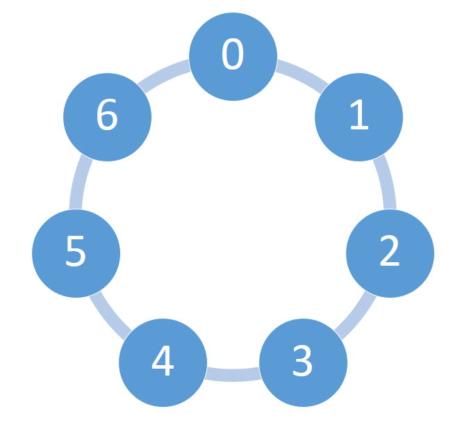 The next simplification is to constrain the space available to the simple 2 dimensional cellular automata. Infinite space means growth can be unbounded. The simplest bounded space is made by joining together the two ends of the line. An example 7 cell universe is shown in the diagram below. Cell zero is now neighbours with cell six.