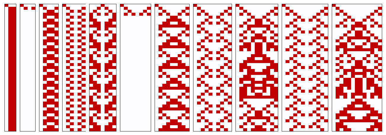 I’ve rushed ahead a little. By selecting Rule 90 I have settled on one of the more interesting patterns. So backing up slightly here are all the patterns produced in our simple 7 cell universe. Notice how 9, 11, 13, and 15 are negative images of other rules. While 4,5,12 are mirror images. There is also some duplication with 8 and 10.